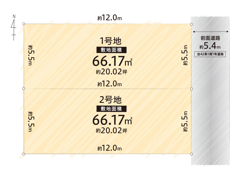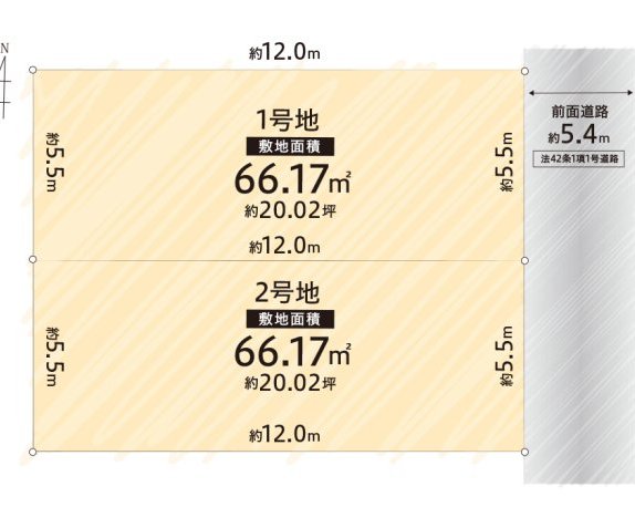 | その他 | 景観法、宅地造成及び特定盛土等規制法、文化財保護法、都市再生特別措置法 1号地:66.17㎡ (約20.01坪) 2号地:66.17㎡ (約20.01坪) 1区画購入:132.19㎡ 雨水:分流 |