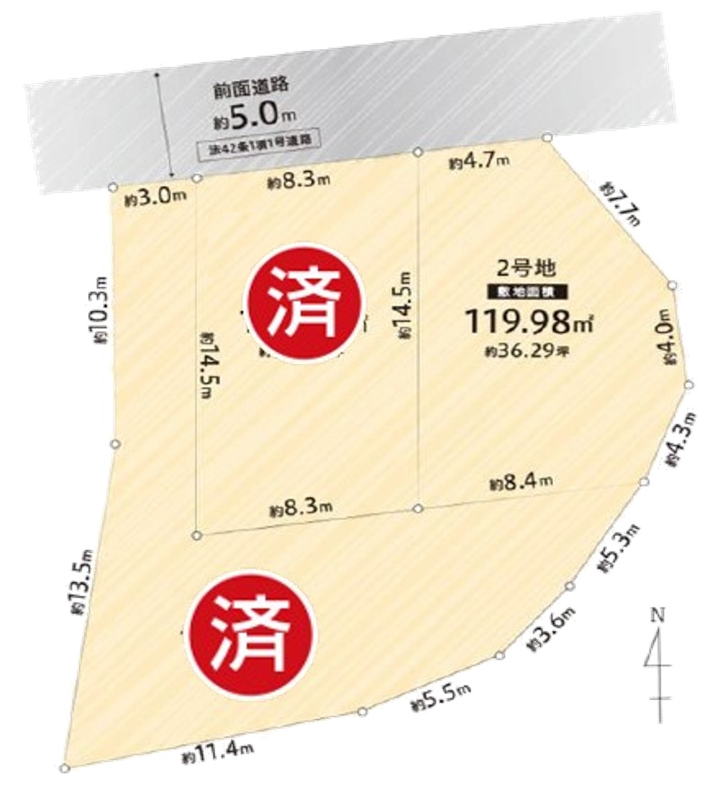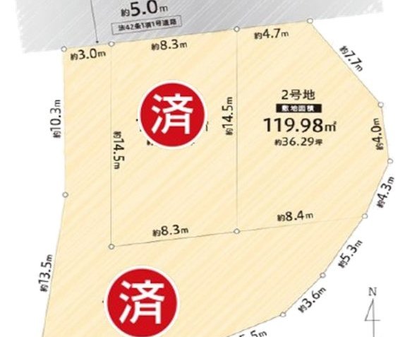 | 土地面積 | 119.98㎡(35.99坪) | 接道状況 | 北側公道に幅員約4.3m 42条1項1号道路 |