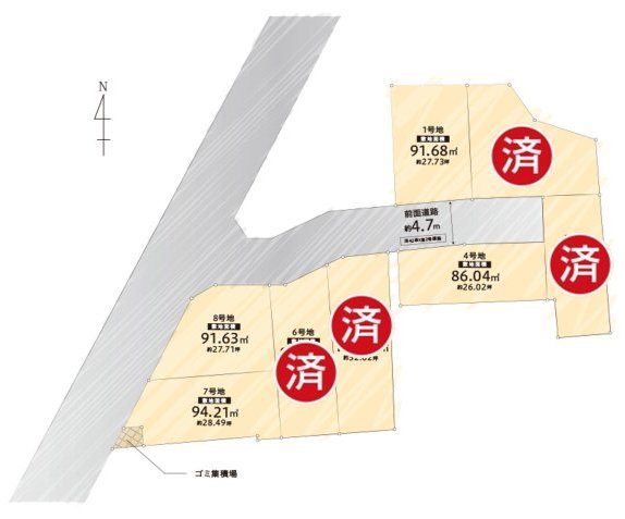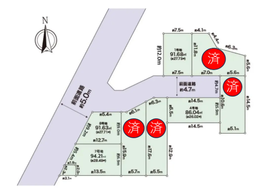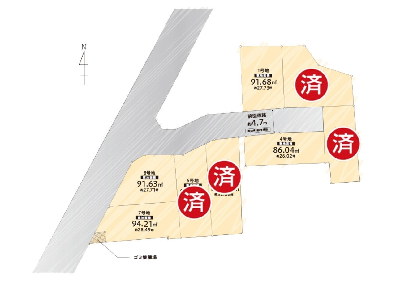 | 土地面積 | 86.04㎡(26.01坪) | 接道状況 | 方角: 北 幅員:4.7 m 42条1項2号/ 方角: 西 幅員:5m 42条1項1号 |