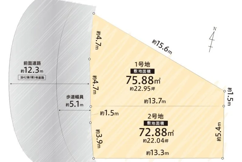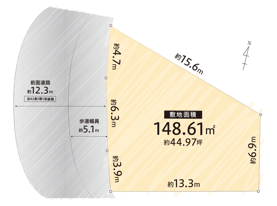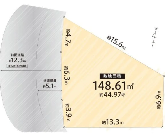 | 土地面積 | 148.76㎡(44.77坪) | 接道状況 | 北側 法42条1項1号に約9m接面/ 幅員約6m |