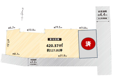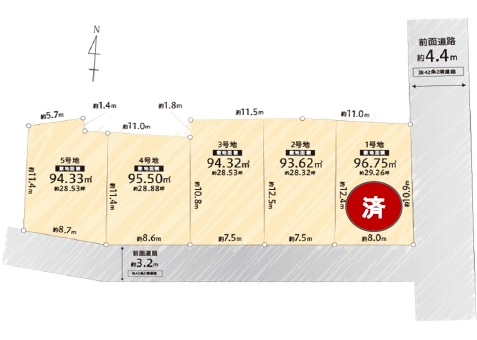 | 土地面積 | 94.33㎡(28.43坪) | 接道状況 | 方角: 東 幅員: 4.2m / 方角: 南 幅員: 1.6m 42条2項 |