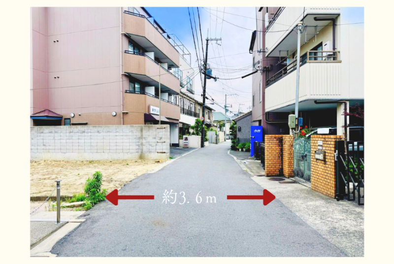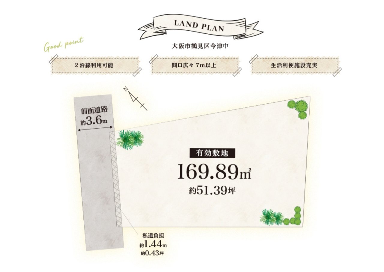 | 土地面積 | 169.89㎡(51.12坪) | 接道状況 | 北西側 公道に約7.65m接面/ 幅員約3.6m 道路負担有 1.44㎡ |