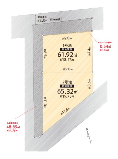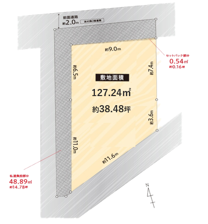 | 土地面積 | 127.24㎡(38.41坪) | 接道状況 | 方向:北側 幅員4ⅿ42条2項、42条1項3号 方向:南 幅員11.64ⅿ42条1項1号 |