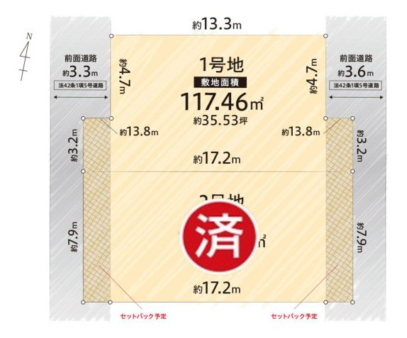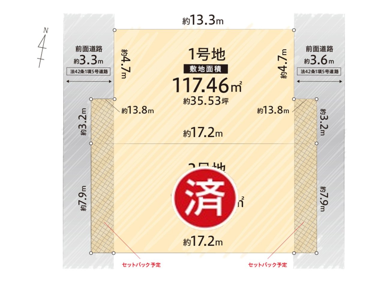 | 土地面積 | 117.46㎡(35.39坪) | 接道状況 | 西側 幅員約3.5m 42条1項5号、東側 幅員3.2m 42条1項5号 |