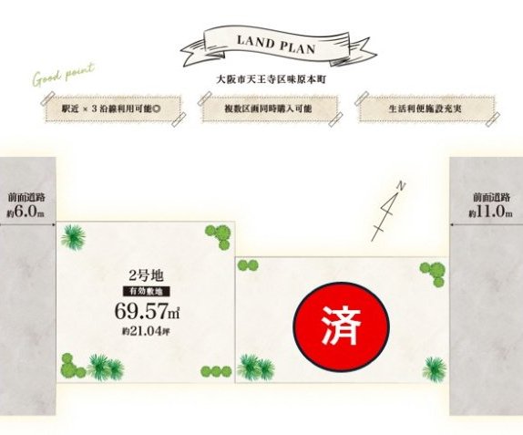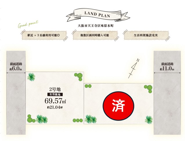 土地面積 | 69.57㎡(20.87坪) | 接道状況 | 西側公道に約6m接面/ 幅員約6m 東側公道に約5m接面/ 幅員約11m 42条1項1号道路 |