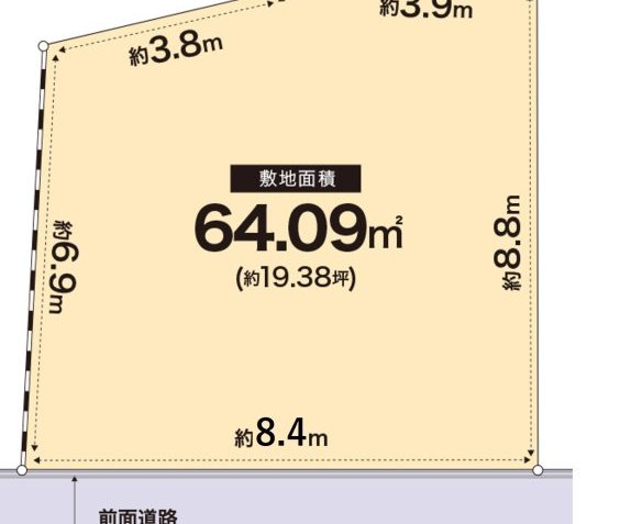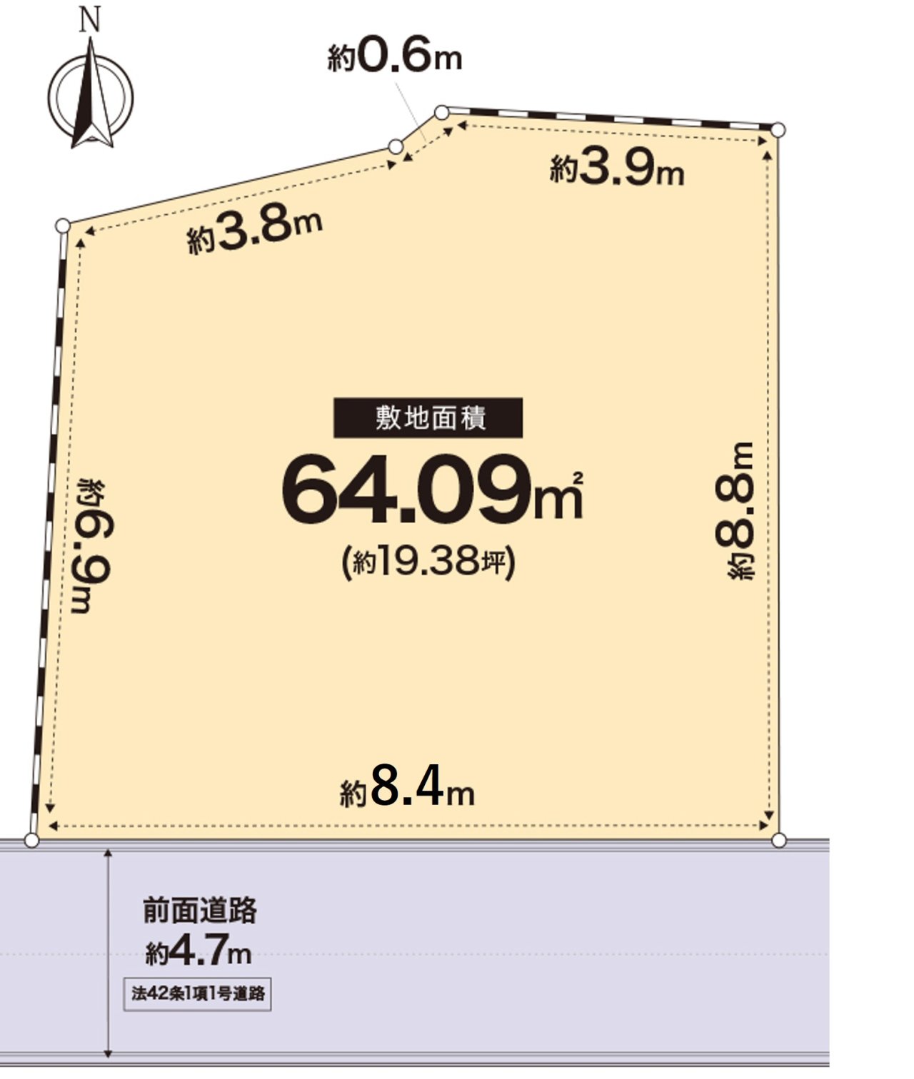 土地面積 | 64.09㎡(19.36坪) | 接道状況 | 南側公道に約8.4m接面/ 幅員約4.7m 42条1項1号道路 |