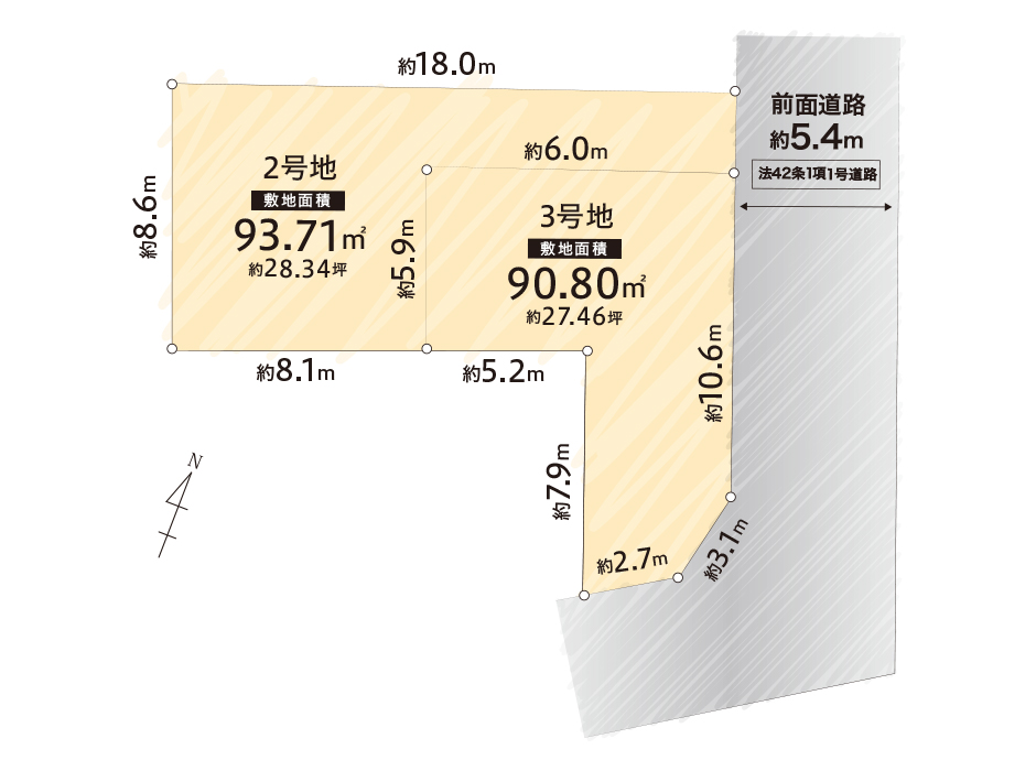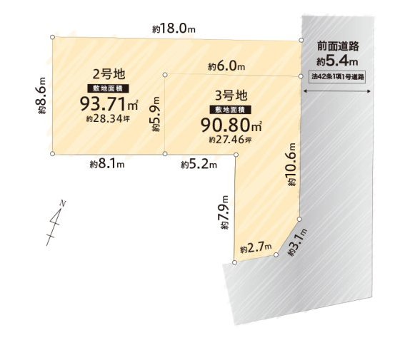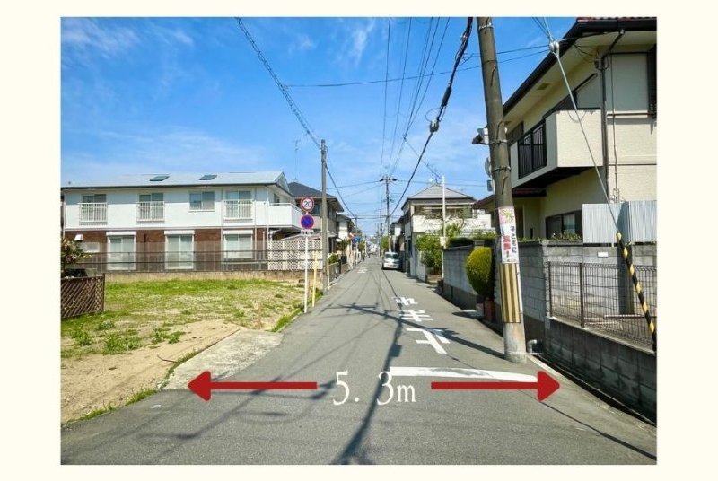土地面積 | 109.87㎡(32.97坪) | 接道状況 | 南側公道幅員約4.3m ・東側公道幅員約5.3m 42条1項1号道路 |