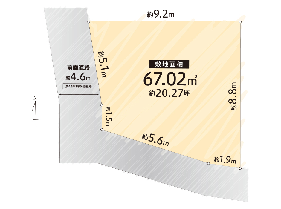 | 土地面積 | 66.42㎡(19.96坪) | 接道状況 | 西側、南側に幅員約4.6m/接面約約14.1m 42条1項1号 |